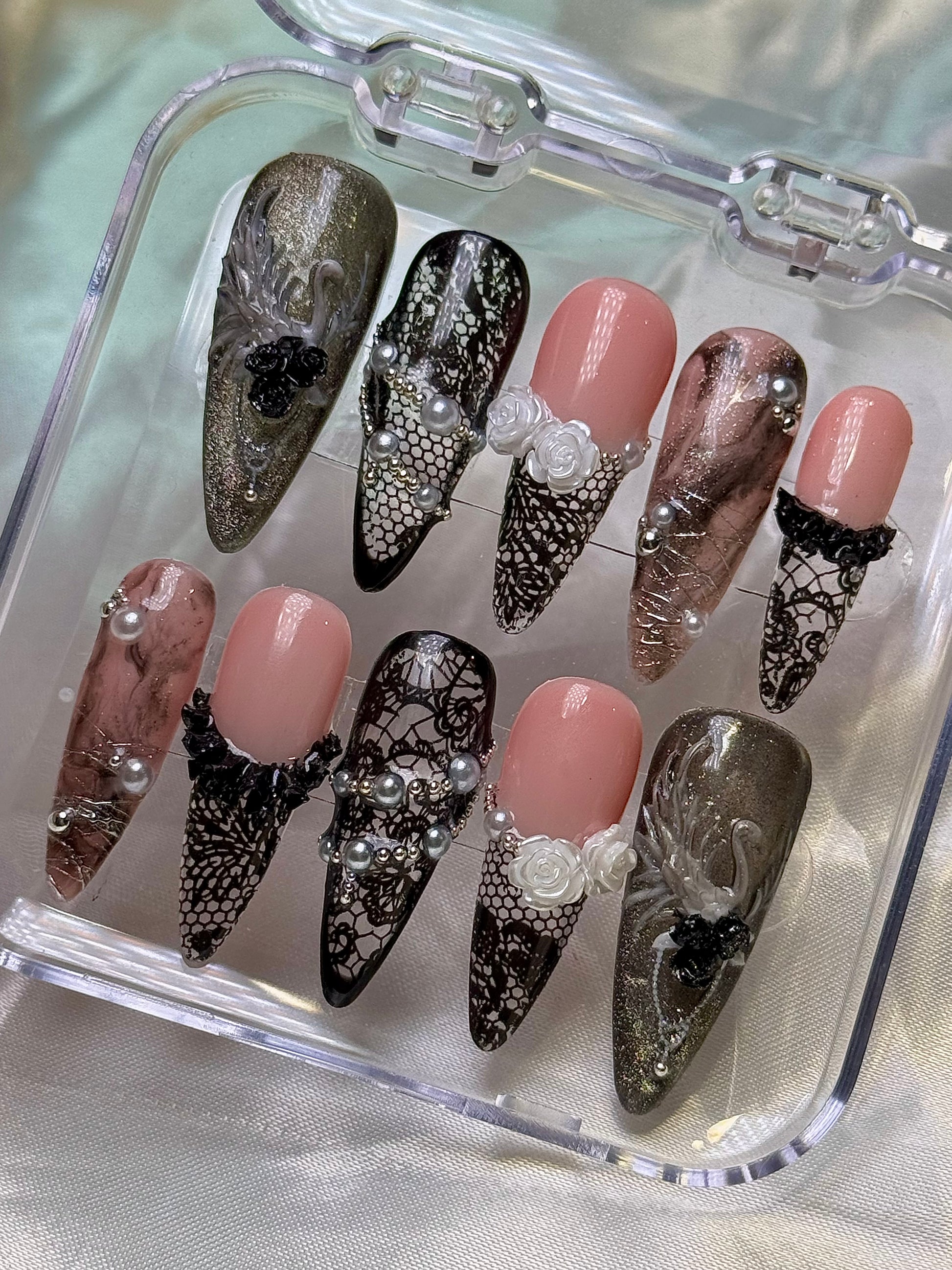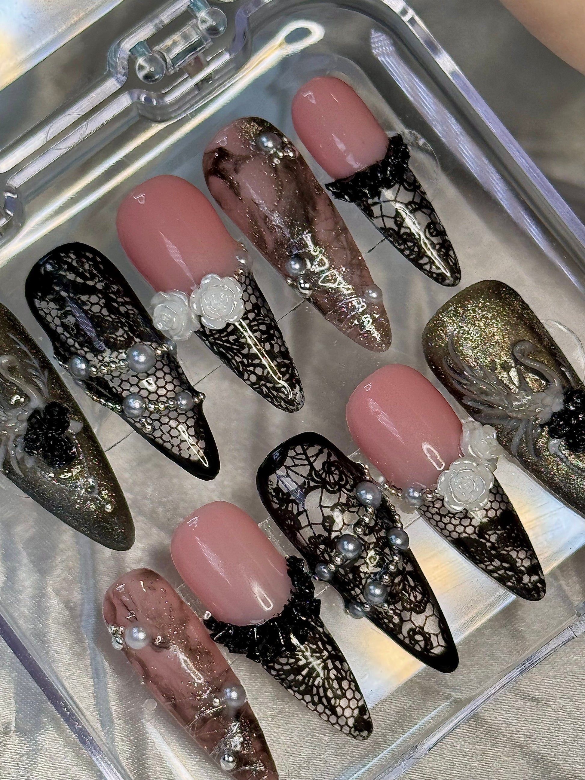 • This gorgeous black and white set is inspired by the “Born Again” music video. With elegant beadwork, silver accents, and lace detailing, these nails capture the fierce energy and confidence of the video’s style. Perfect for making a statement, they embody the intersection of high-fashion and street edge.
