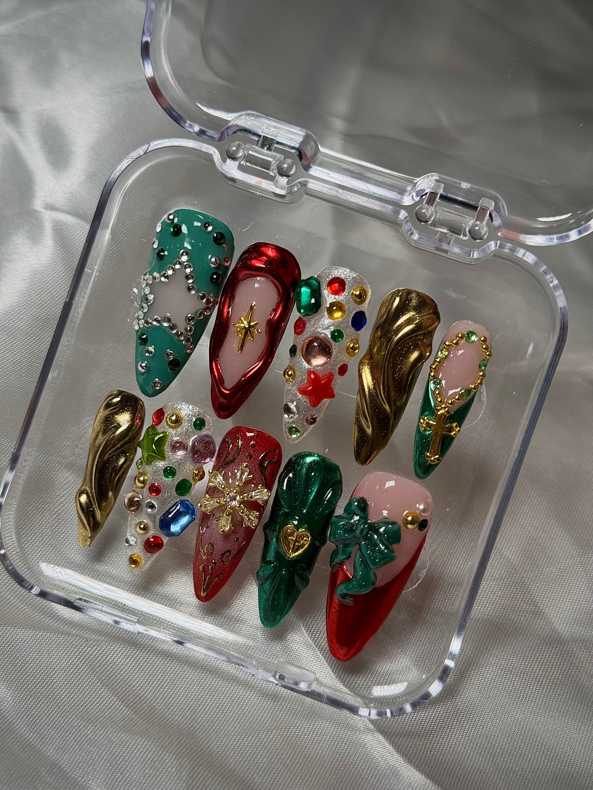 - This Christmas set has gone viral! Featuring detailed artwork and beautiful chrome elements, this set is perfect for the holiday season. These nails are sure to get you on the nice list.
