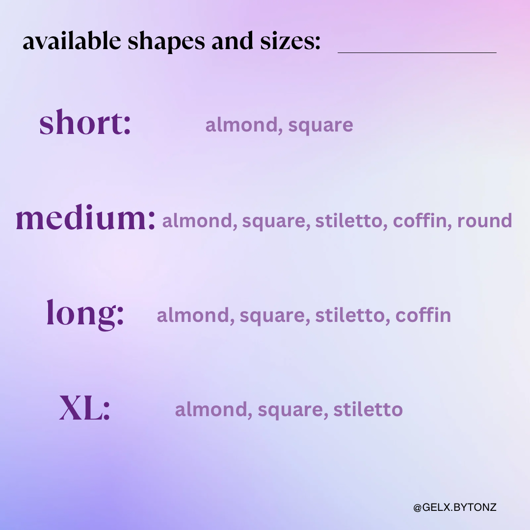 - Please DM on instagram (@gelx.bytonz) or email me (gelx.bytonz@gmail.com) PRIOR to adding to cart. In your message, Please include details/inspo of preferred shape & length, and how you want your custom set to look like. Details can include: photos of other sets, photos of themes, description of what you want your set to look like. Feel free to be as specific with photos and descriptions as you like! You will be quoted for the set after I have looked through your inspo and communicated with you.