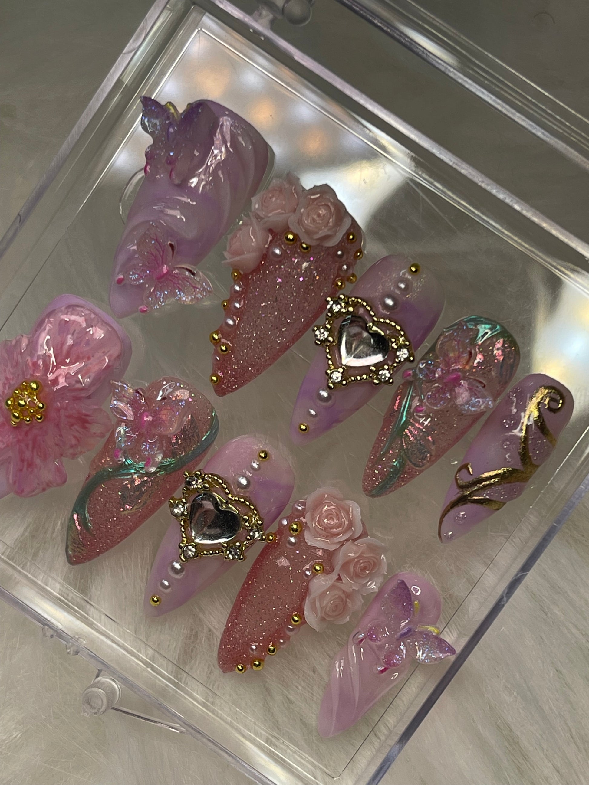 - This set is magical, cutesy, and delicate. Featuring popular “garden fairy/ forest” vibes, this set showcases a light pink and light purple colour theme, with 3D sculpted flowers, butterfly charms and gold accents.