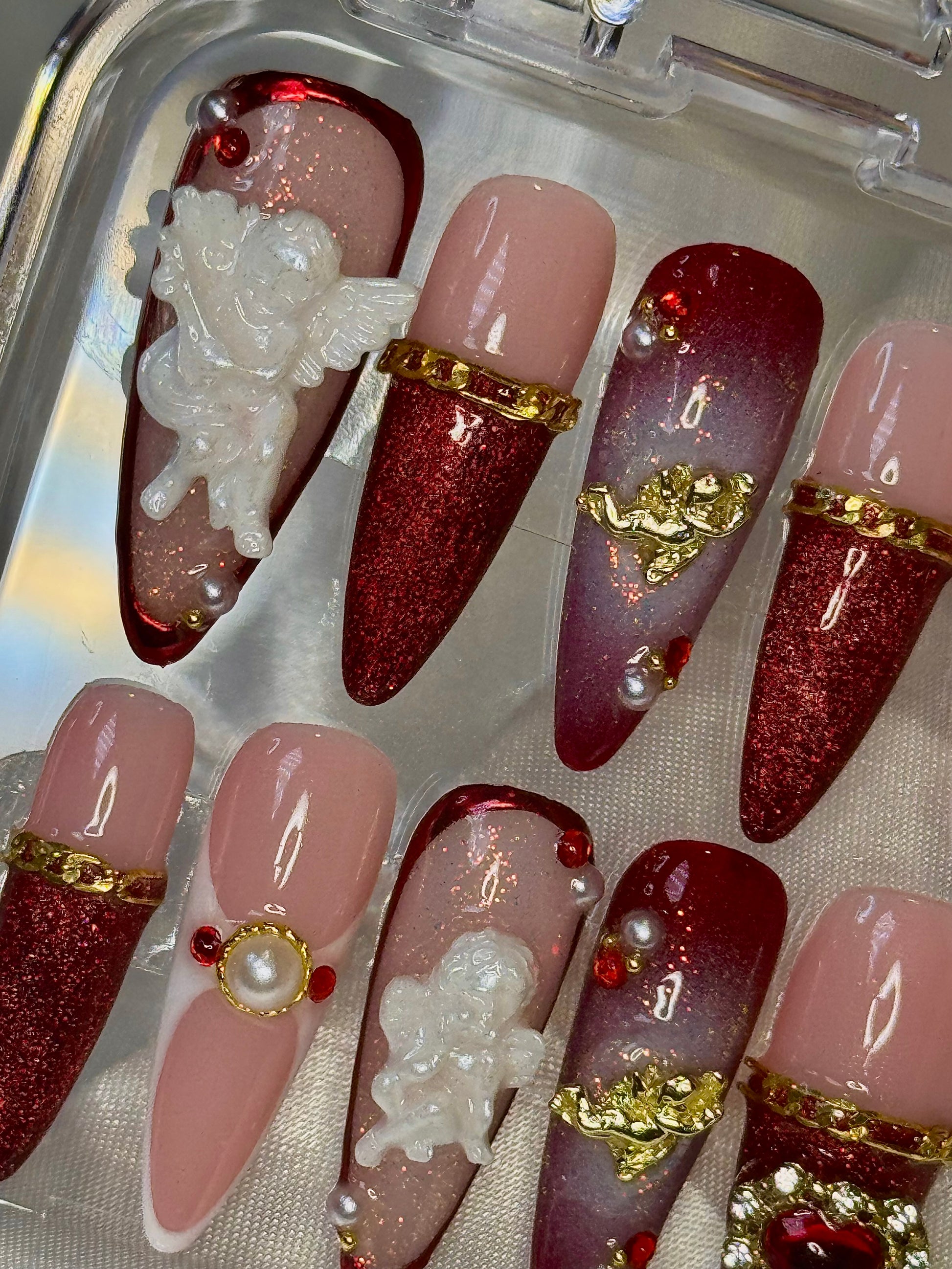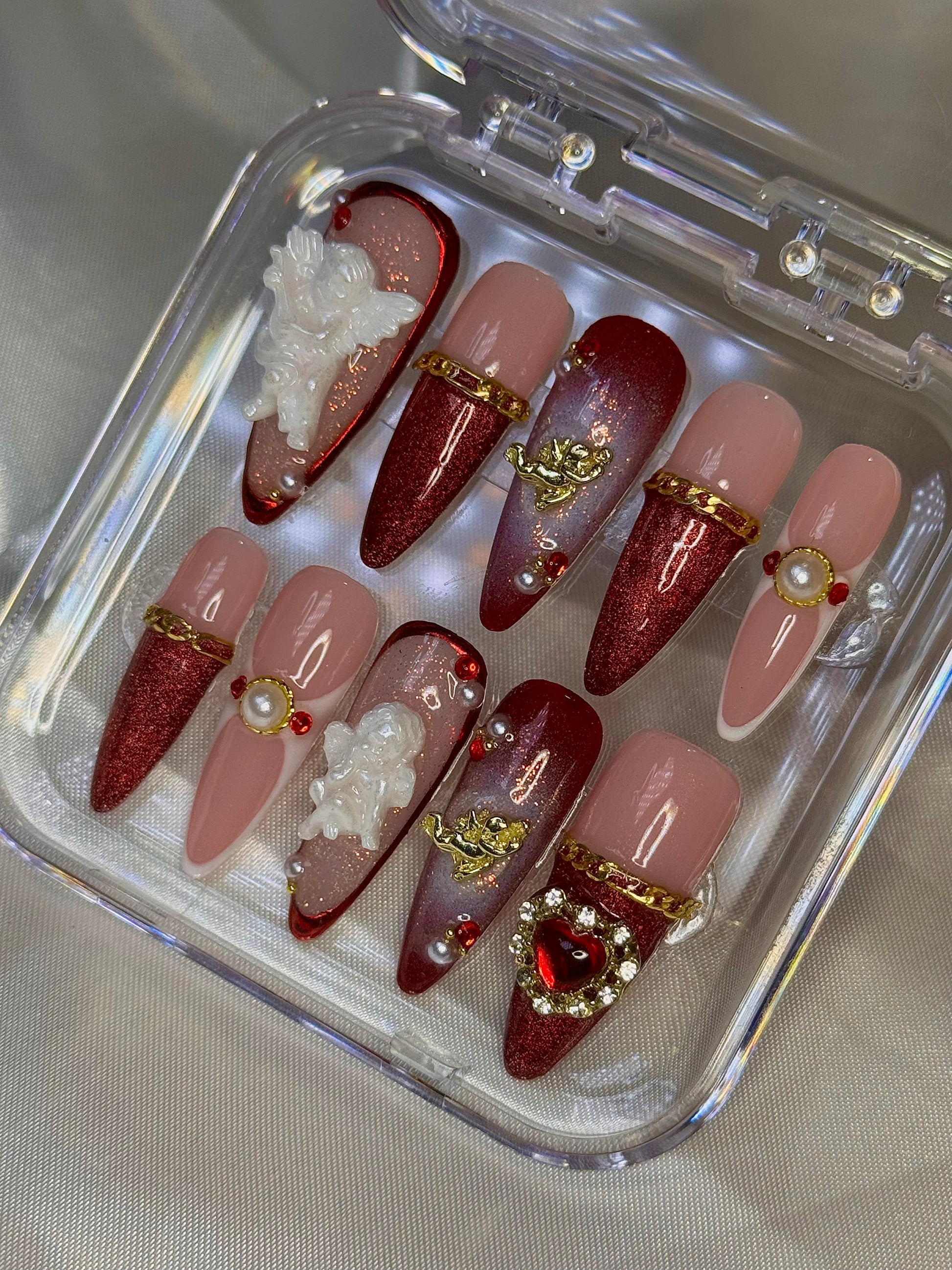 • The perfect set to get you in the Valentine’s Day mood. This set features red cat eye polish, glitter, chrome & gold details, and 3D cupid angels. This set is elegant and we love her.